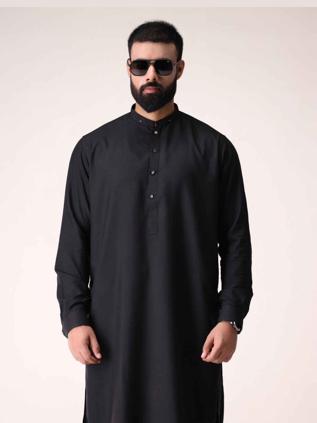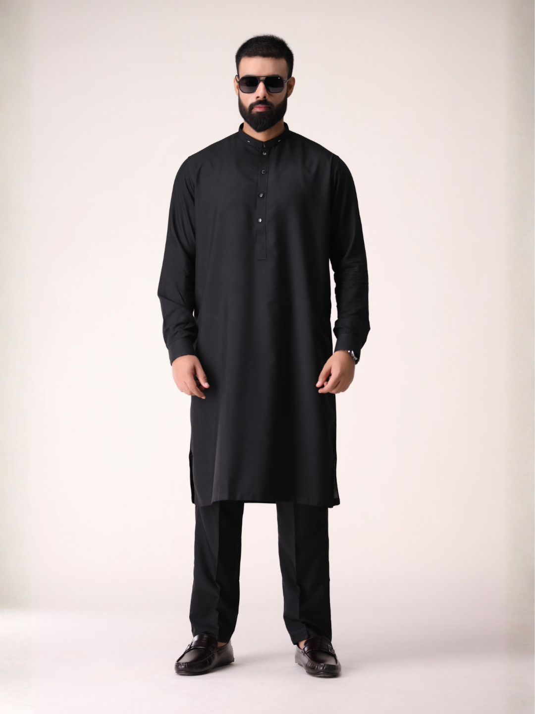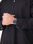 Explore our stylish Black Kameez Shalwar, featuring a unique mandarin collar and matching thread details that add a touch of elegance to your traditional wear. Crafted with attention to detail, this outfit is perfect for casual gatherings or formal events. Pair it with your favorite brown shoes to elevate your look and make a statement.