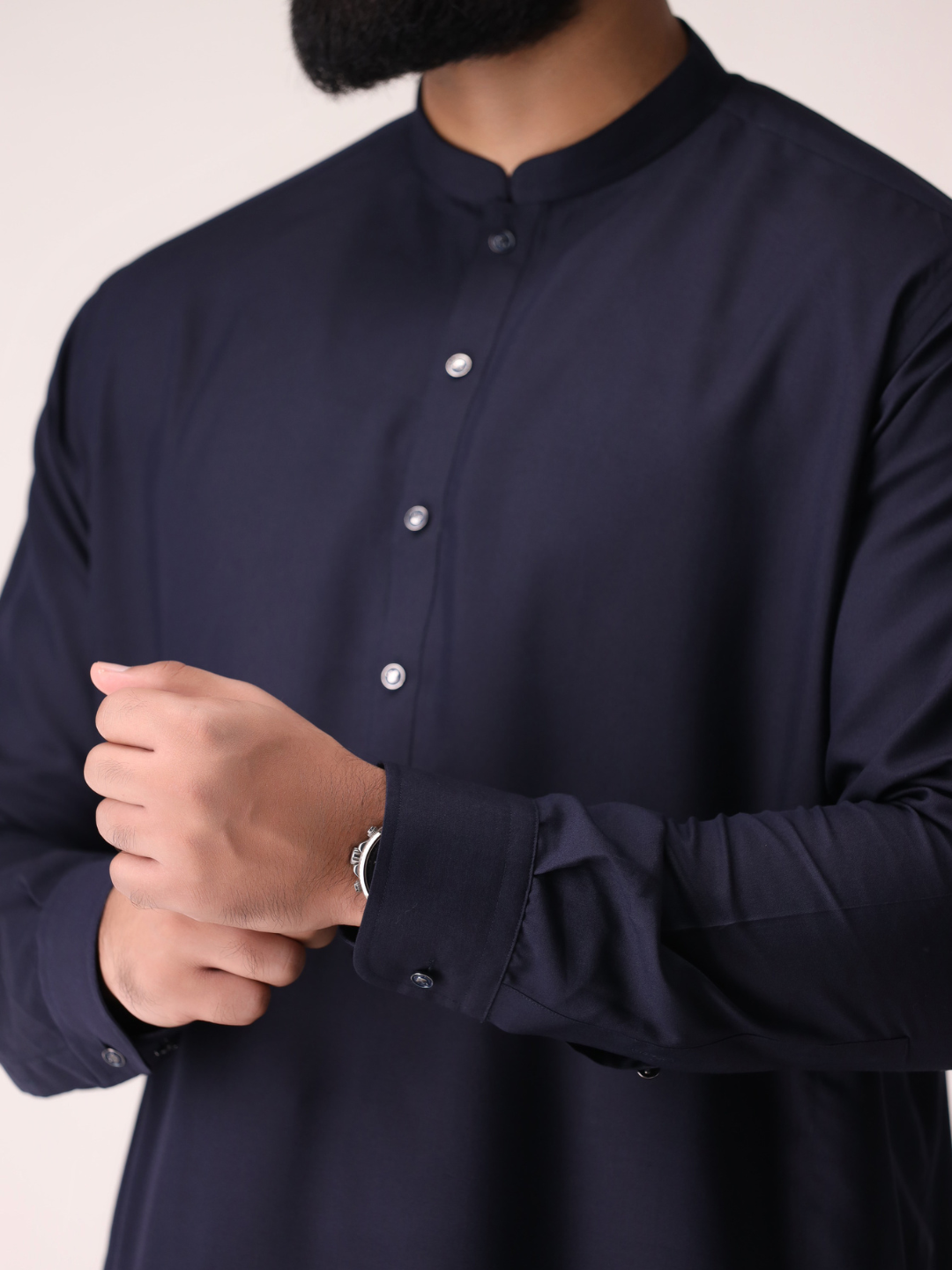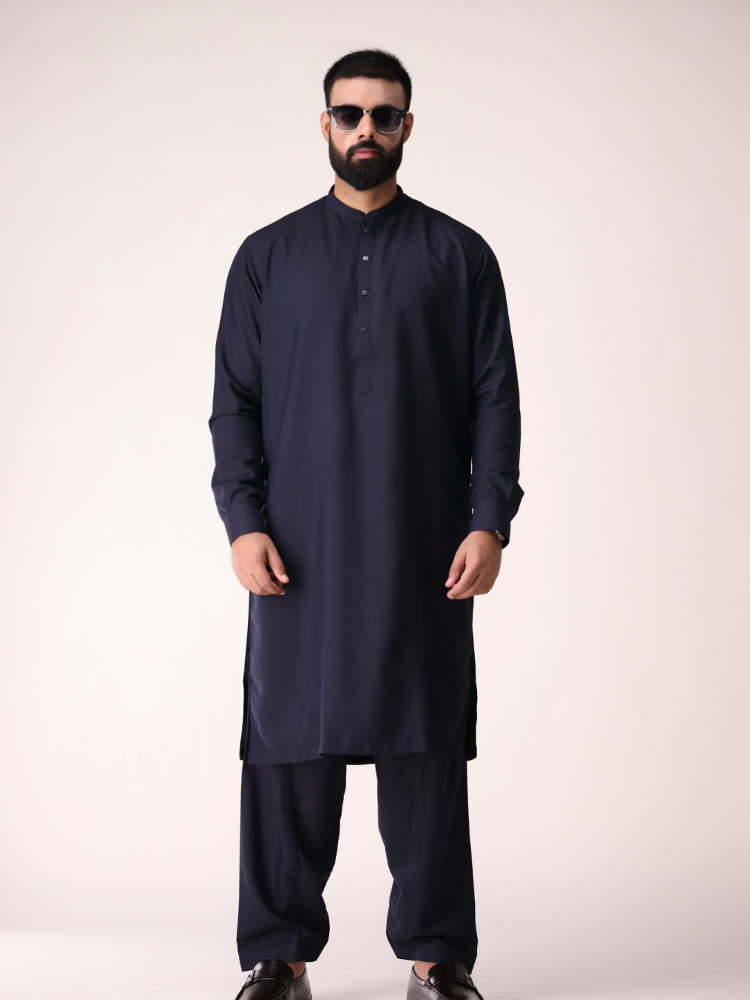 Explore our stylish Navy Blue Kameez Shalwar, featuring a unique mandarin collar and matching thread details that add a touch of elegance to your traditional wear. Crafted with attention to detail, this outfit is perfect for casual gatherings or formal events. Pair it with your favorite brown shoes to elevate your look and make a statement.