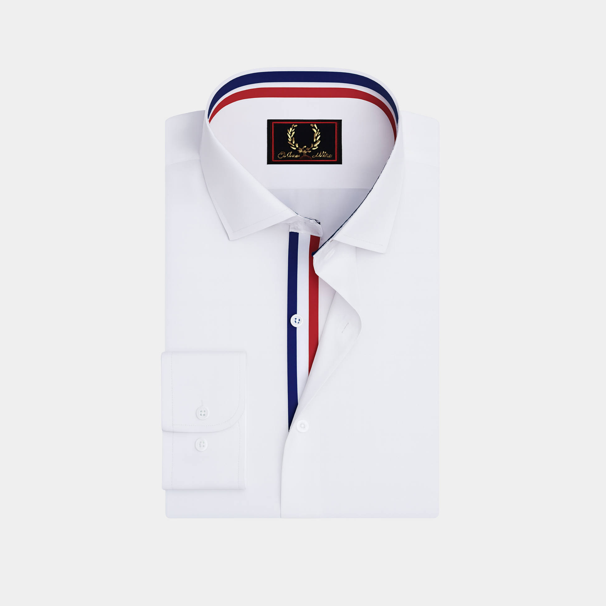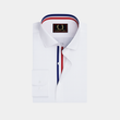 Make a statement with our sophisticated white shirt featuring a captivating combination of red and blue lining. With its sleek design, vibrant colors, and contemporary aesthetic, it effortlessly combines elegance with modernity, allowing you to showcase your unique style with confidence and panache.